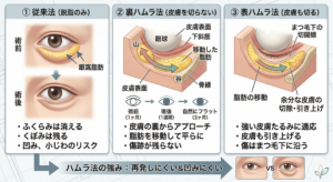 裏ハムラ法: 山の脂肪を切り取らずに、下へスライドさせて谷を埋めます。山と谷の段差がなくなるため、立体的でフラットな美しい目元に仕上がり、再発しにくいのが特徴です。