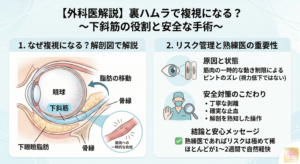 手術後、内部で腫れが出たり、血が溜まったりすること(血腫)があります。これが下斜筋を物理的に圧迫してしまうと、筋肉がスムーズに収縮できなくなり、左右の目のピントがズレて「ものが二重に見える」という現象が起きます。