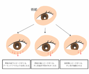たれ目の方法として、「切らないたれ目(糸で縛る方法)」もありますが、かなりの確率で後戻りすること、微調整が難しいことから、あまりオススメはしません。