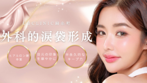 「外科的涙袋形成」は、ヒアルロン酸などの注入物を使わず、医療用の特殊な糸でまぶたの組織を内側から引き寄せ、ぷっくりとした涙袋を形成する施術です。